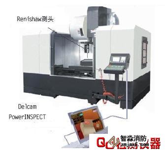 傳統(tǒng)的零件測(cè)量方法常常采用離線測(cè)量。需把被測(cè)零件從加工設(shè)備轉(zhuǎn)移到測(cè)量設(shè)備上,有時(shí)在一個(gè)加工過程中甚至需要幾個(gè)來回,使檢測(cè)工件的費(fèi)用,超過了工件的加工費(fèi)用。因此通過使用在線測(cè)量來代替離線測(cè)量,使得在線檢測(cè)的效率和精確度得到保證的條件下,使質(zhì)量檢測(cè)過程更靠近加工過程,從而保證了工件從加工設(shè)備上卸下的時(shí)候就是合格品。本文介紹的基于Renishaw和Delcam的加工中心在線檢測(cè)是通過為加工中心配備一個(gè)Renishaw測(cè)頭以及PowerINSPECT在線檢測(cè)軟件,構(gòu)成加工中心在線檢測(cè)系統(tǒng),如圖1所示。