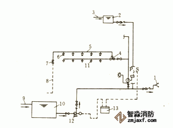 1—水泵接合器;2—高位水箱;3—進水管;4—雨淋閥;5—傳動管;6—閉式噴頭;7—手動閥;8—排水管;9—進水和;10—水池;11—開式噴頭;12—消防泵,13—控制箱