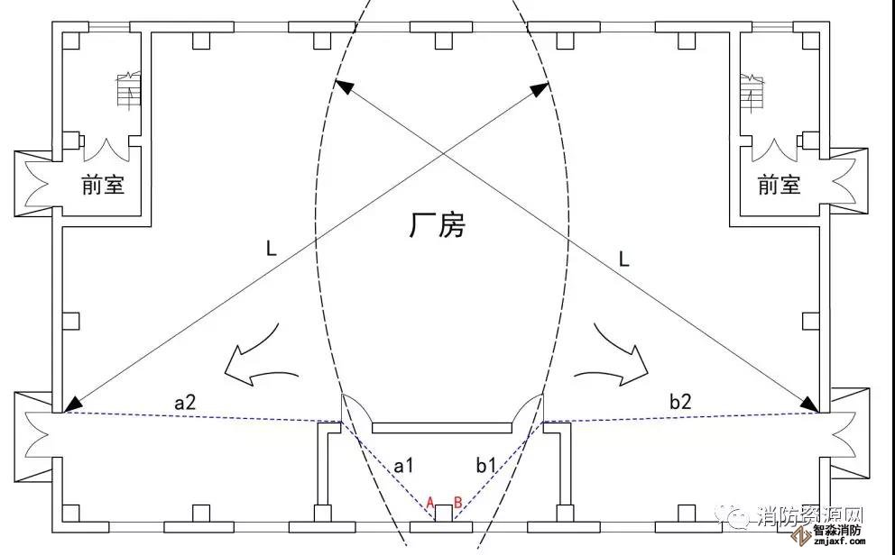 2、規范圖示爭議:新版《建規》圖示3.7.4,標示了廠房內任意一點到安全出口的直線距離(圖二),本示例存在室內隔間,對于隔間內的任意一點,應采用行走直線距離計算,宜應采用圖示三的方案,A點至安全出口的疏散距離為(a1+a2),B點至安全出口的疏散距離為(b1+b2)。