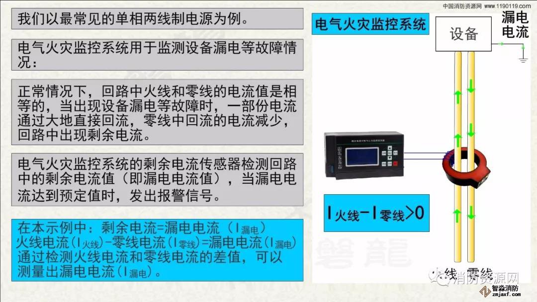 電氣火災監控系統的剩余電流傳感器檢測回路中的剩余電流值(即漏電電流值),當漏電電流值達到預定值時,發出漏電或短路報警信號。